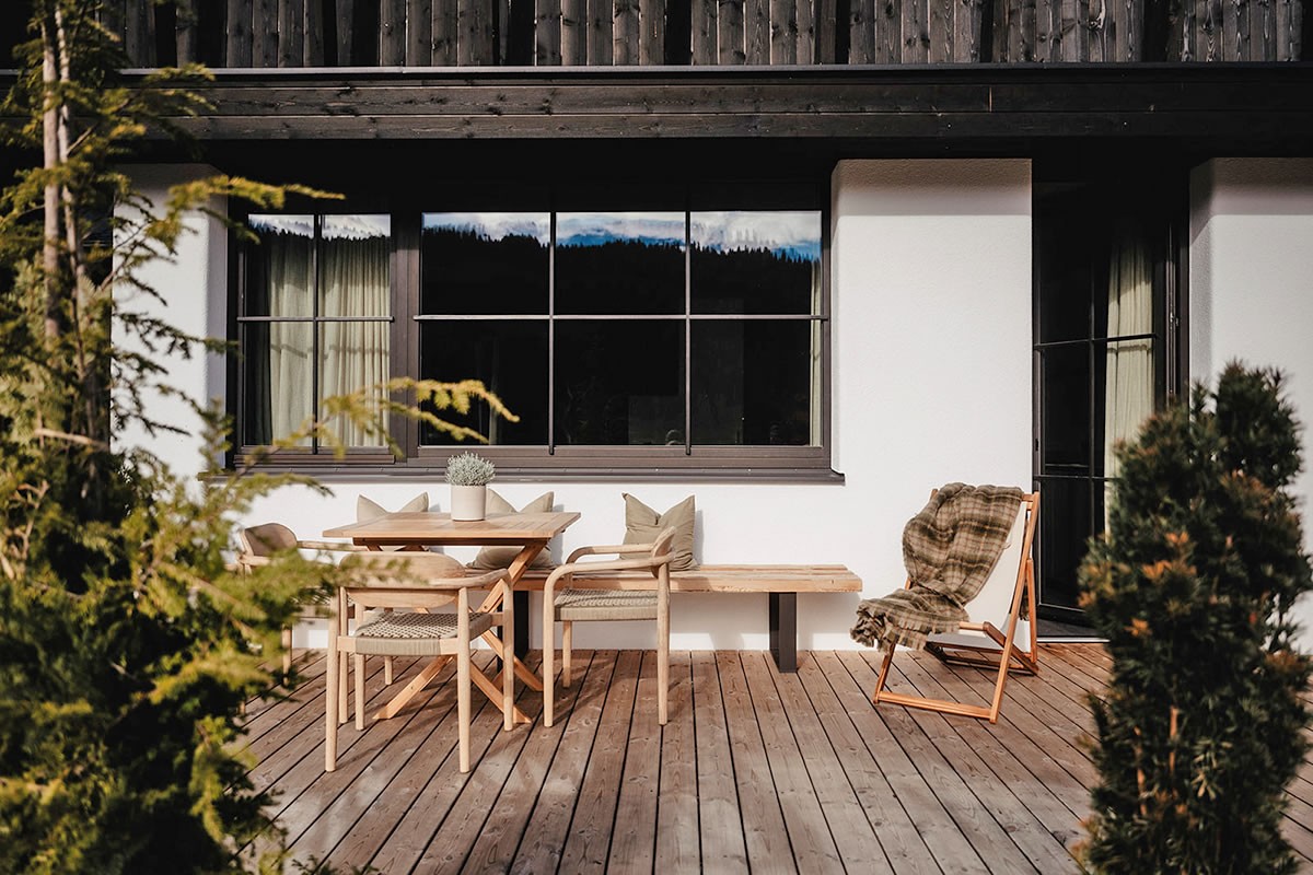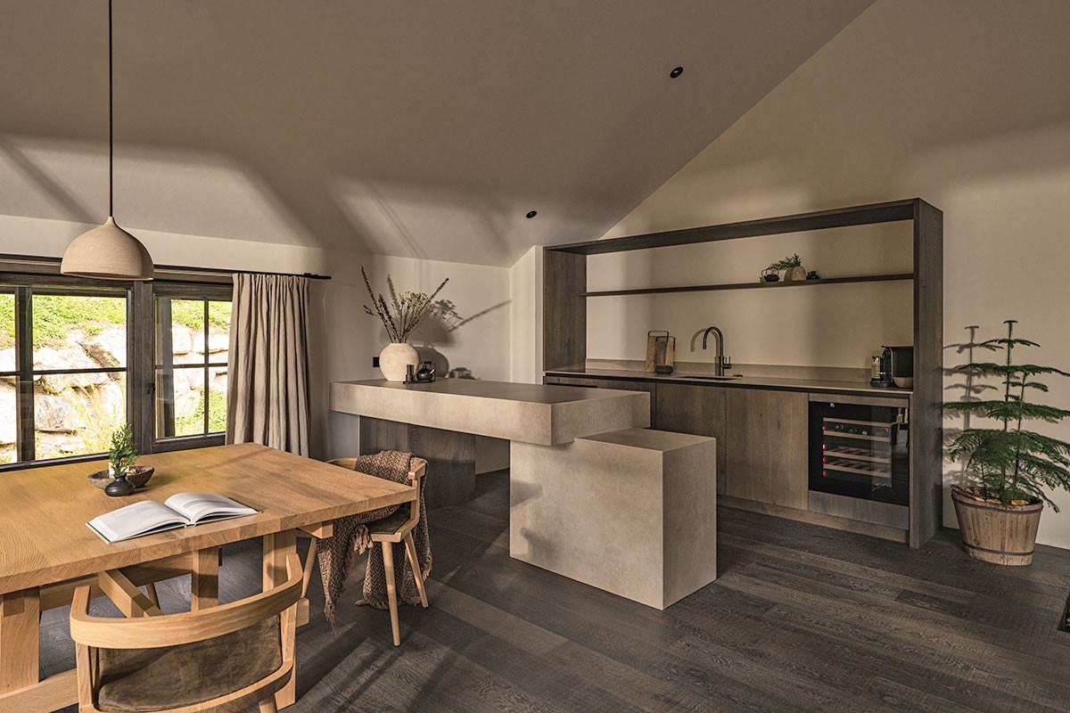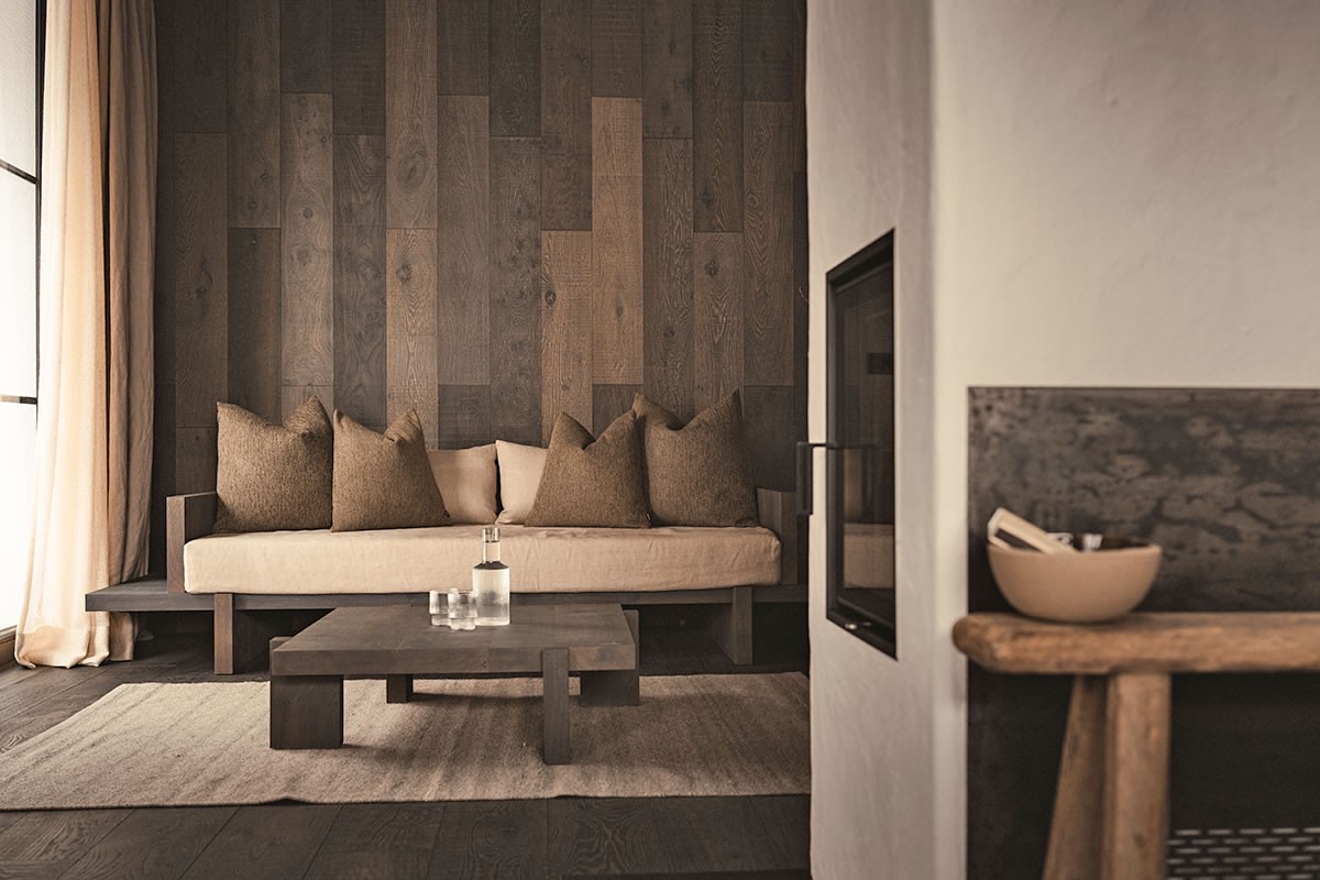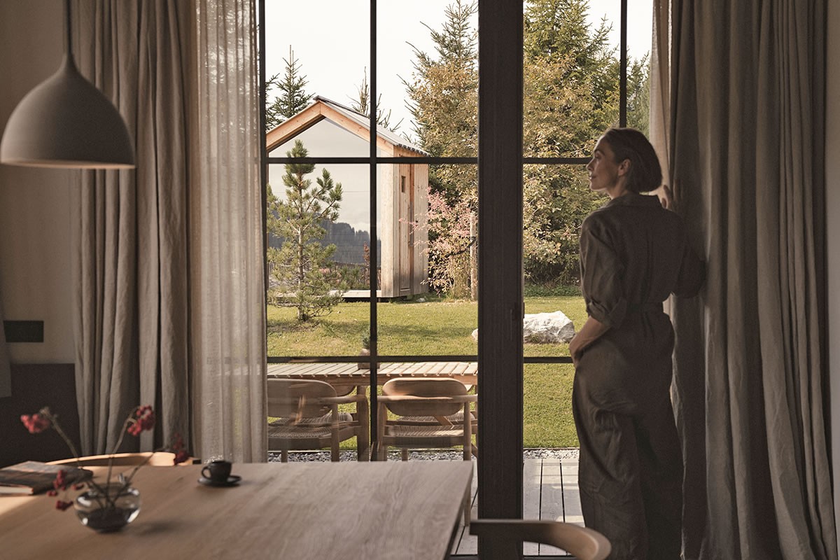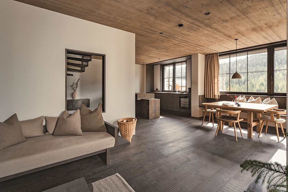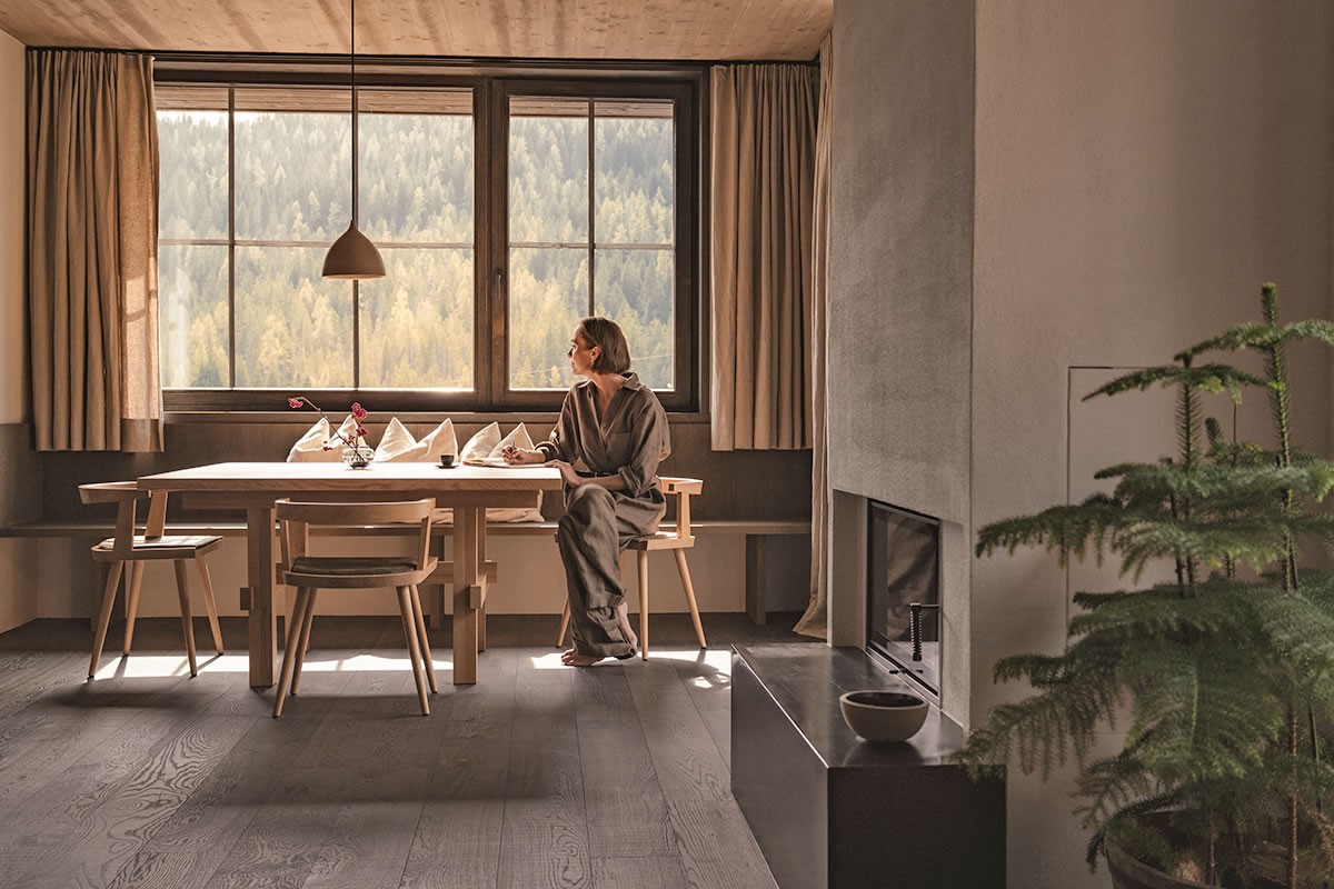 - Warmes Naturdesign, das beruhigt und den Blick durch die Panoramafenster auf die Berge leitet